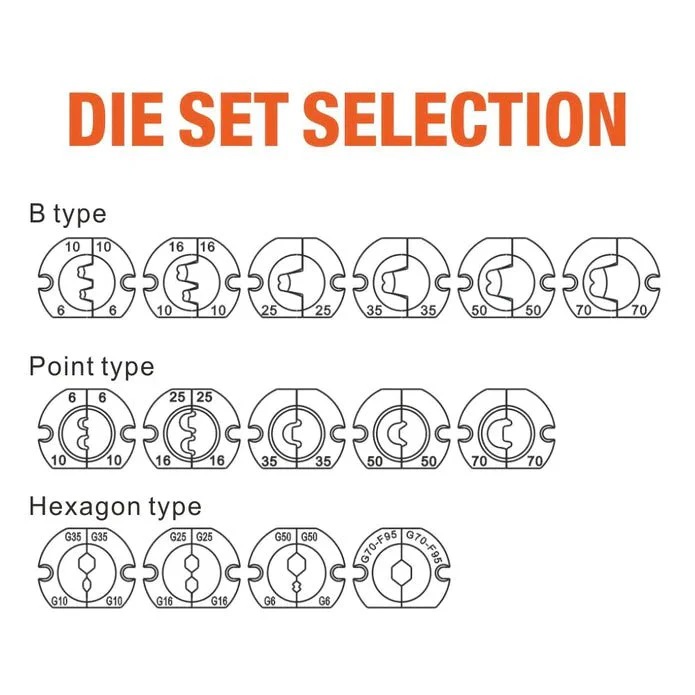 แม่พิมพ์ Hex-type ขั้วต่อแบตเตอรี่ AWG10-2/0 ขนาดสายไฟ 6-70 มม.² มีทั้งแบบทองแดงและอลูมิเนียม พบได้ในรถยนต์และรถบรรทุก มีลักษณะการบีบย้ำแบบหกเหลี่ยม